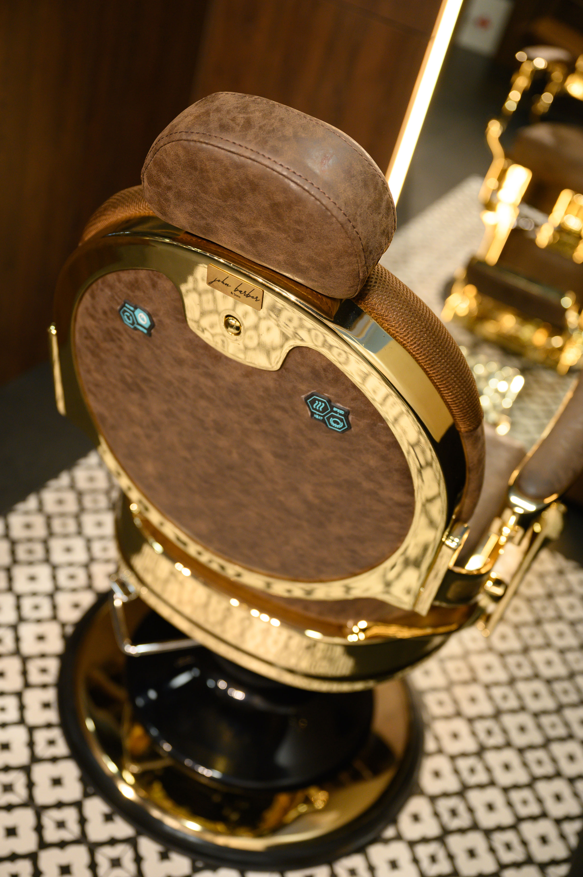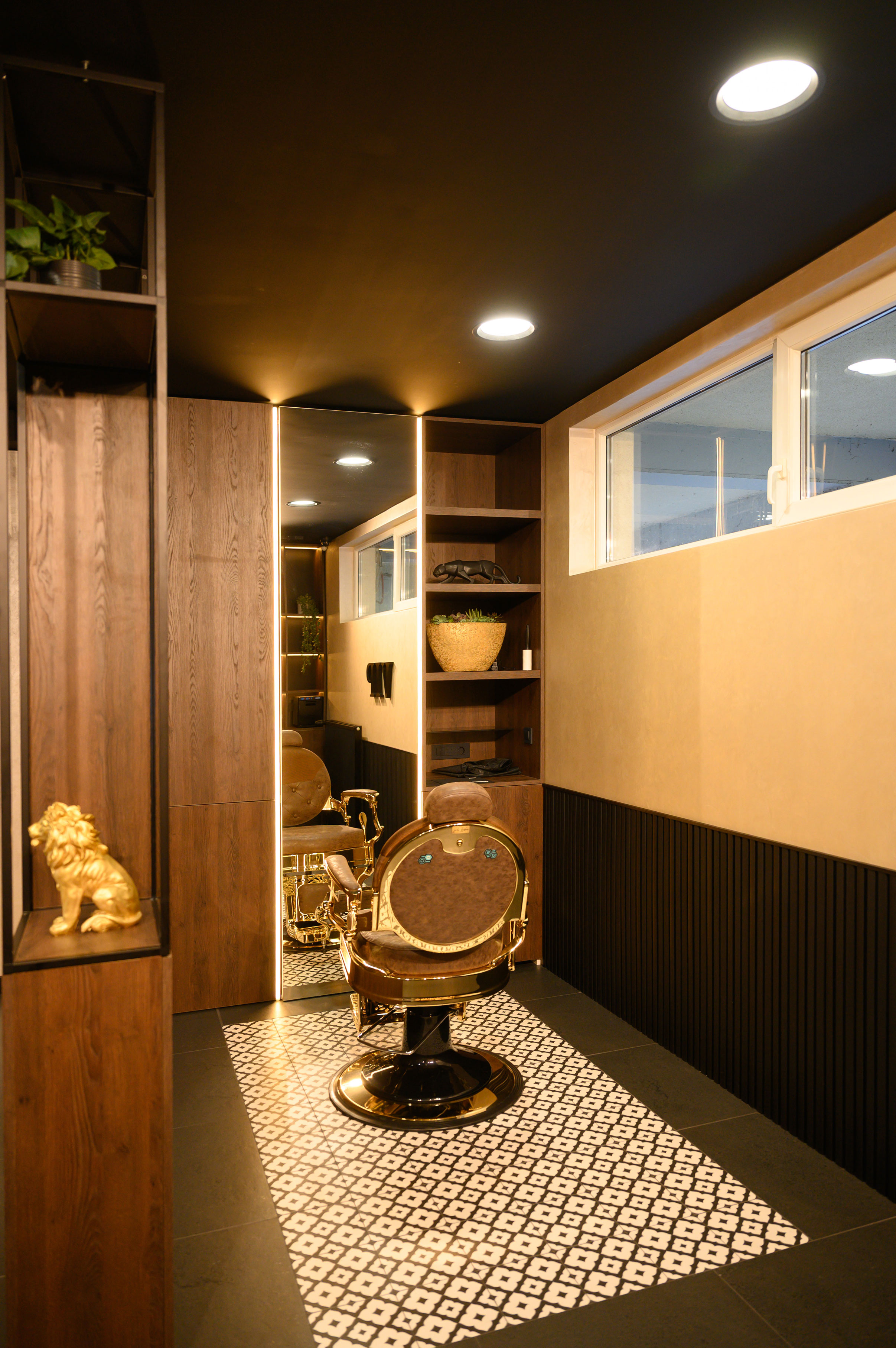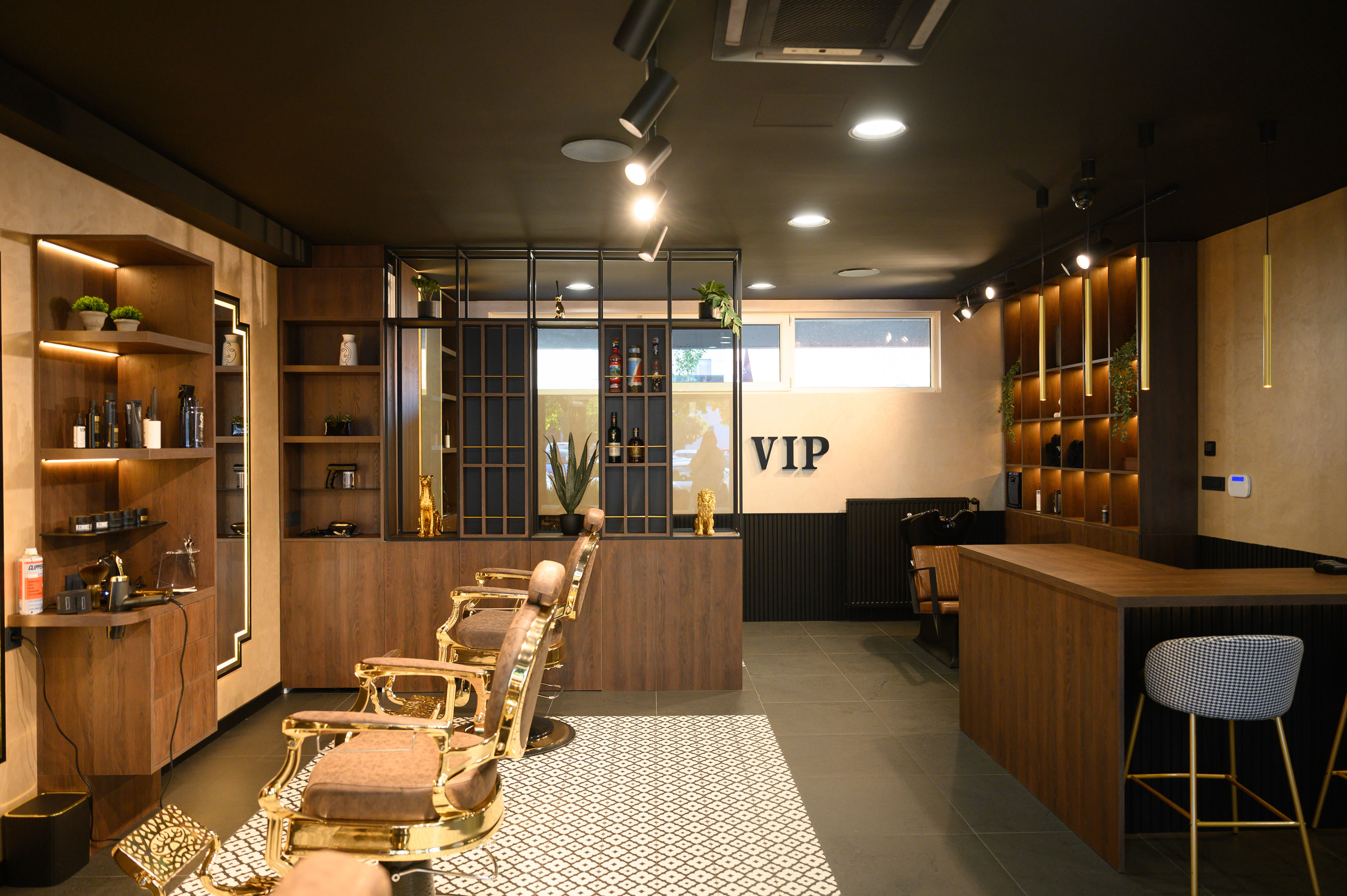 U svakom kutku barbershopa osjeća se osobna priča – od suvenira s putovanja do pažljivo biranih detalja na policama. Luksuzne retro stolice s pozlatom unose dozu glamura, dok skladan raspored i topli materijali stvaraju osjećaj domaće atmosfere.
