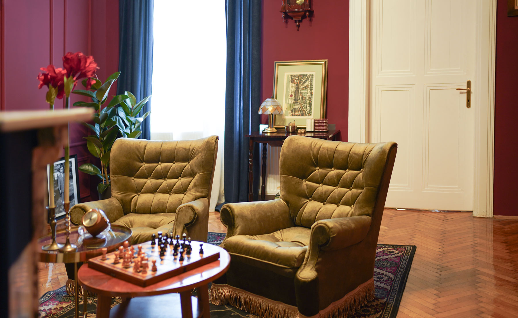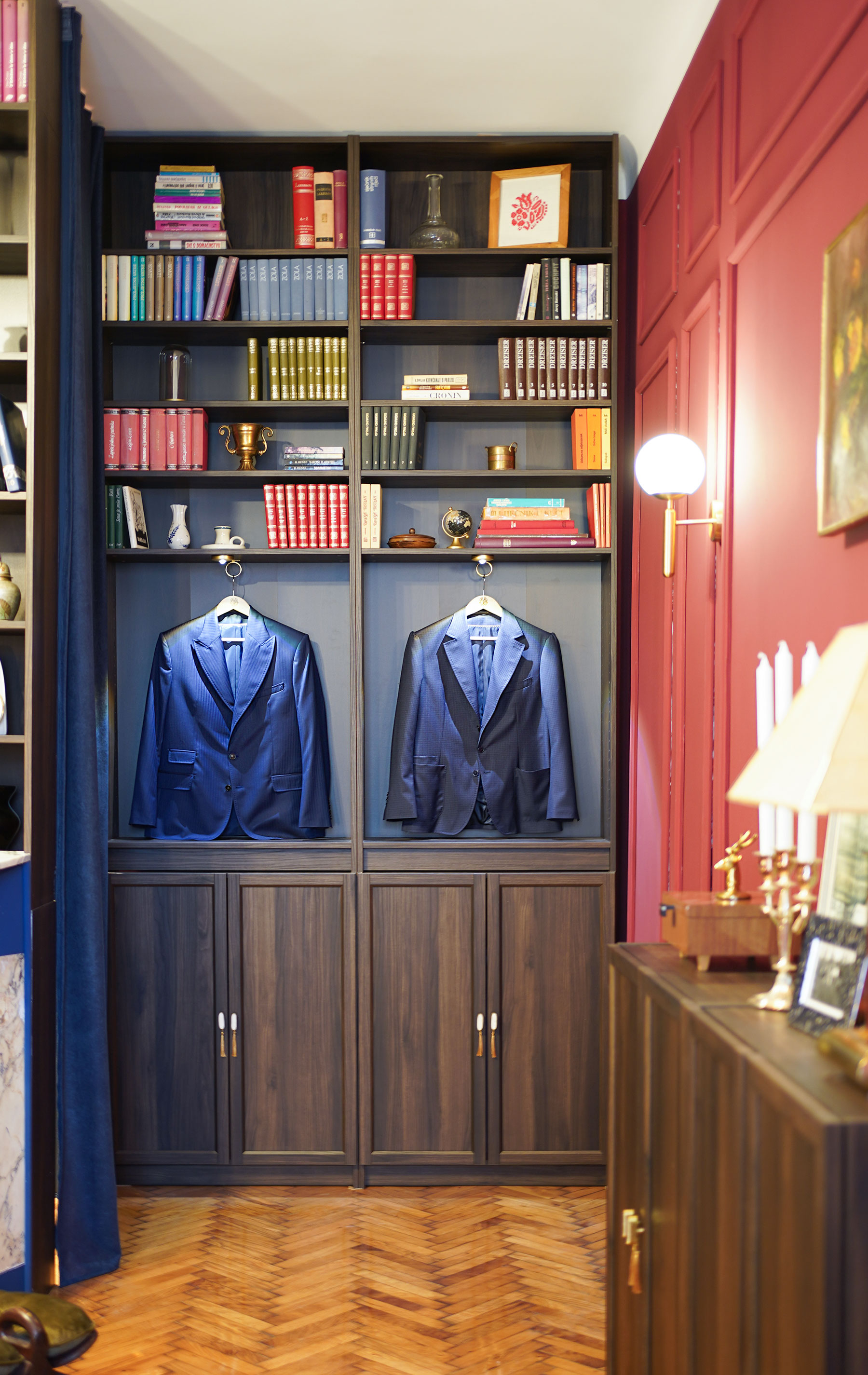 Interijer showrooma podsjeća na privatni kabinet – kombinaciju vintage ateljea, knjižnice i diskretnog kluba. Tamni drveni tonovi, mesingani detalji, arhivske knjige te miris kože i drvenih nota stvaraju atmosferu staroeuropskih salona. Rasvjeta, galerija slika i umjetnina dodatno produbljuju narativ prostora i čine ga mjestom koje se doživljava, a ne samo posjećuje.